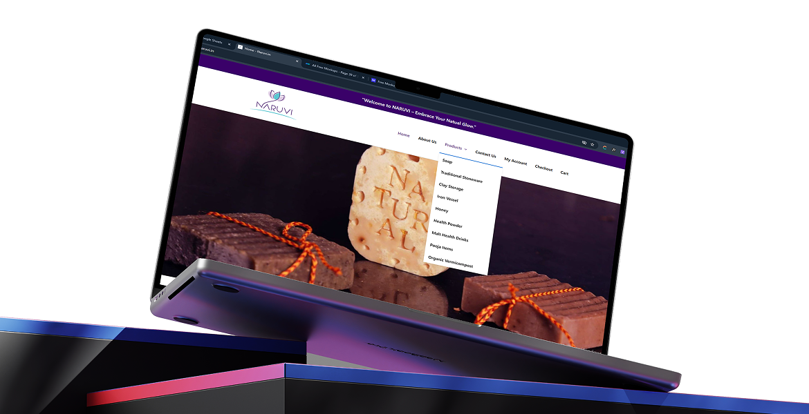 The final website provides a visually appealing and user-friendly eCommerce platform that effectively showcases Naruvi’s natural skincare products. Customers can easily browse handmade soaps, explore product details, and complete purchases through a secure checkout system. The responsive design ensures a seamless experience across devices. The website strengthens the brand’s digital presence and provides a scalable foundation for future product expansion.