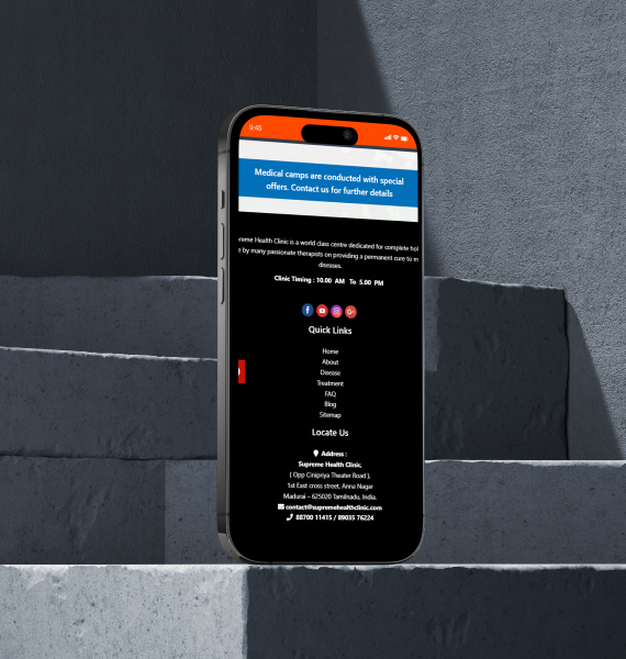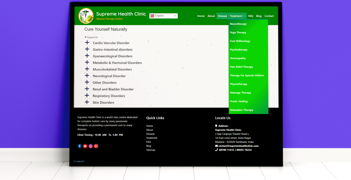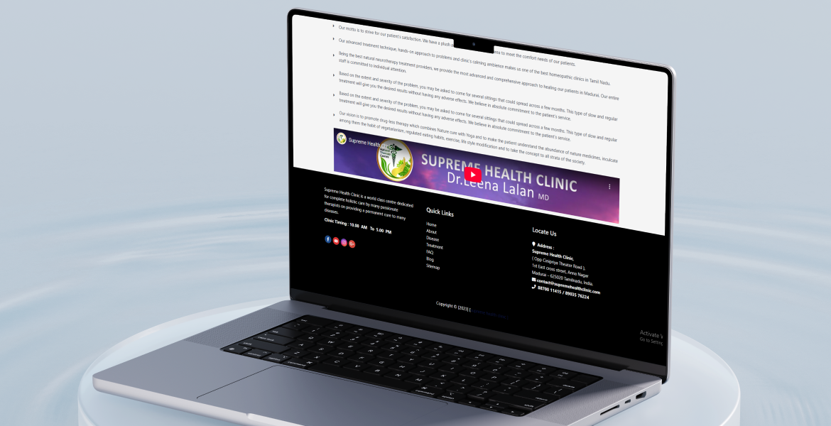 The final website strengthens Supreme Health Clinic’s digital presence by clearly presenting its therapy services and holistic healing approach. The structured layout improves user navigation, while optimized performance ensures smooth access across devices. The platform now effectively supports patient inquiries and enhances online credibility.